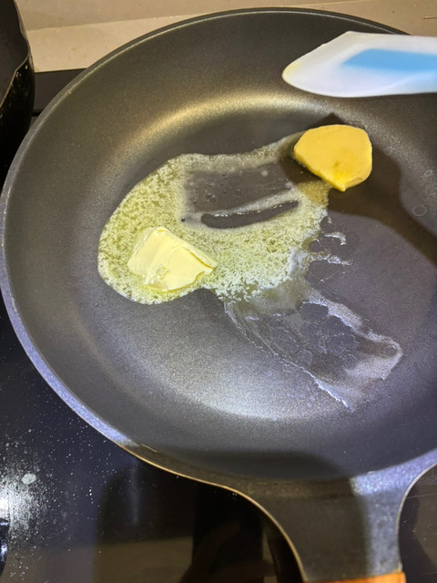 • 無鹽奶油放入鍋中,小火加熱至完全融化。