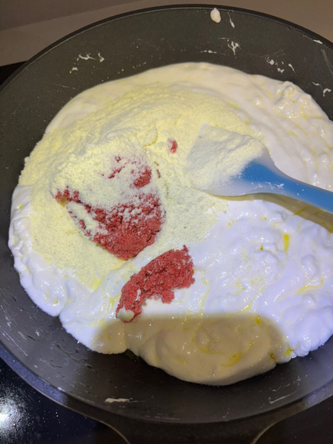 • 加入草莓粉與奶粉,翻拌均勻。